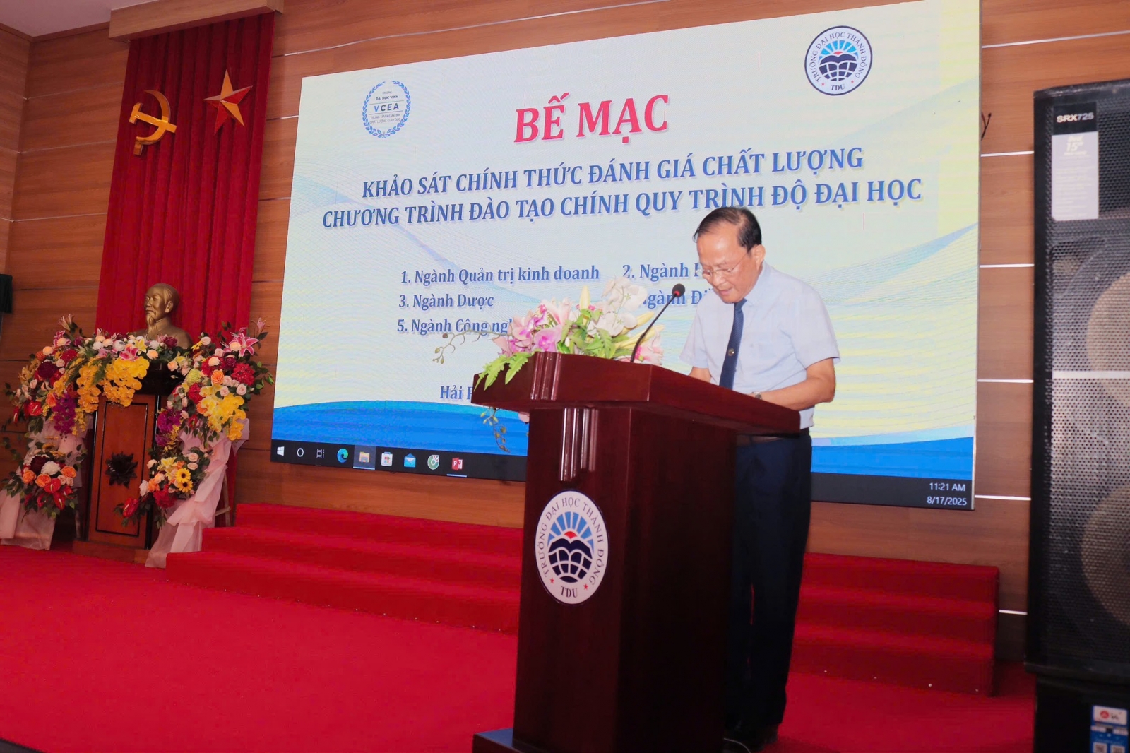 Phát biểu tại buổi lễ, PGS.TS. Lê Văn Hùng – Chủ tịch Hội đồng Trường, Hiệu trưởng khẳng định: “Đợt khảo sát không chỉ là cơ hội để Nhà trường nhìn lại toàn diện các chương trình đào tạo, mà còn là dịp để tiếp thu những góp ý quý báu từ các chuyên gia, từ đó định hướng cải tiến mạnh mẽ hơn nữa trong thời gian tới”.
